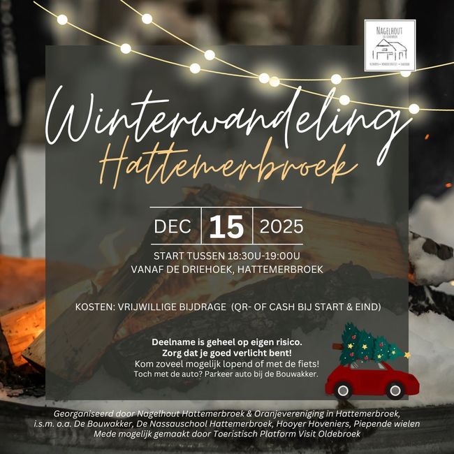 Een sfeervolle en gezellige route, met onderweg muziek, leuks en lekkers. Beginpunt van de wandeling is de Driehoek in Hattemerbroek en de wandeling eindigt bij de Bouwakker. Er kan gestart worden tussen 18.30 en 19.00 uur. Verzoek is om zoveel mogelijk lopend of op de fiets te komen, in verband met beperkte parkeerruimte. Parkeren kan rondom de Bouwakker. Deelname is op eigen risico, zorg dat je als deelnemer goed verlicht bent. Deelname is gratis, wel staat er een melkbus voor jouw vrijwillige bijdrage, mede om deze avond mogelijk te kunnen maken.