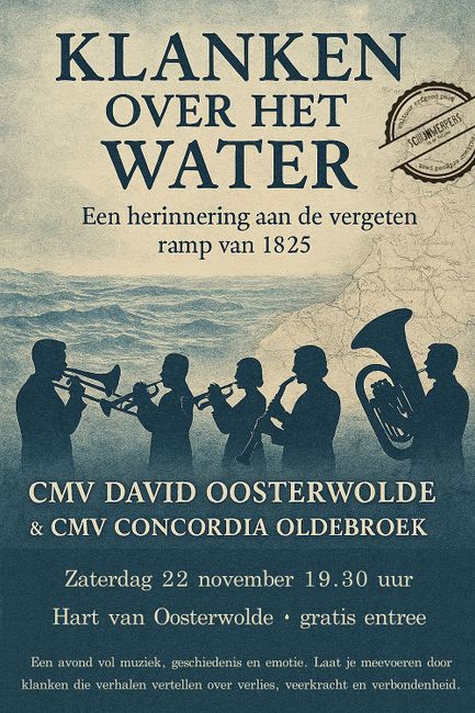 Christelijke Muziekvereniging David Oosterwolde en Christelijke Muziekvereniging Concordia uit Oldebroek bereiden zich gezamenlijk voor op een bijzonder muzikaal evenement. Op zaterdag 22 november as. organiseren beide verenigingen een thematische concertavond onder de titel "Klanken over het water – een herinnering aan de vergeten ramp van 1825".