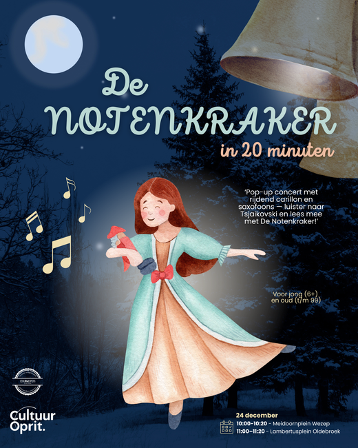 Het is woensdagochtend 24 december. Terwijl je je laatste inkopen doet voor de kerstdagen, hoor je muziek over het plein klinken. Een rijdend carillon verschijnt, samen met twee saxofoons. De bekende muziek uit De Notenkraker van Tsjaikovski vult de winterlucht — en jij kunt het verhaal meelezen terwijl het gespeeld wordt. CultuurOprit komt deze kerst naar Wezep en Oldebroek met een verrassend pop-up concert: