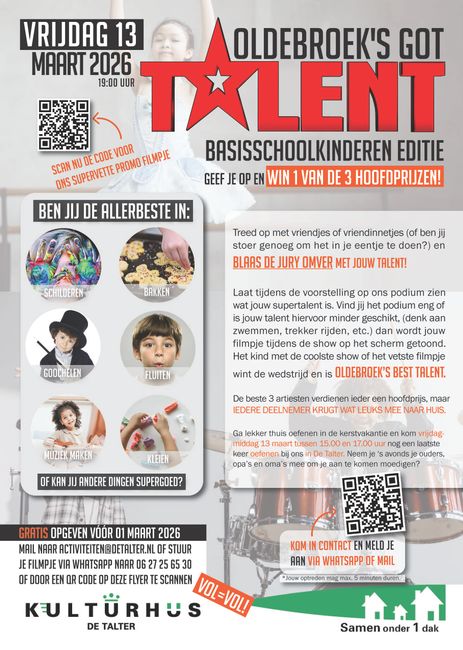 De deelname is gratis en iedereen uit Oldebroek en omgeving is van harte welkom om te komen kijken en de jonge talenten aan te moedigen. Kinderen kunnen zich aanmelden vóór 1 maart via activiteiten@detalter.nl of telefonisch via 06-27256530.