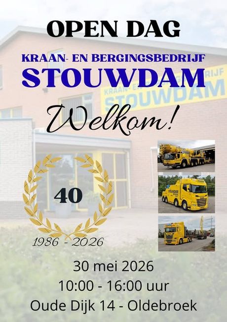 De open dag van Kraan- en Bergingsbedrijf Stouwdam in Oldebroek vindt plaats op zaterdag 30 mei 2026 van 10:00 tot 16:00 uur. Het evenement wordt gehouden aan de Oude Dijk 14 in Oldebroek. Bezoekers kunnen kennismaken met de activiteiten van het bergingsbedrijf.