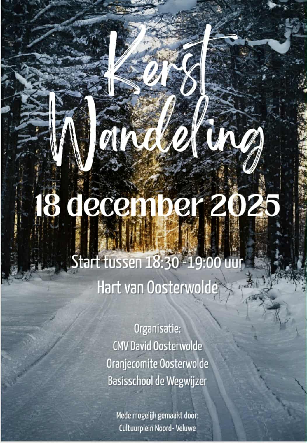 Op donderdag 18 december organiseert Oranjecomite Oosterwolde een kerstwandeling met onderweg verschillende muziek uitvoeringen door CMV David. U kunt zelf in groepjes de route lopen tussen 18:30 en 19.00 uur. Start en einde op het plein bij Hart van Oosterwolde.