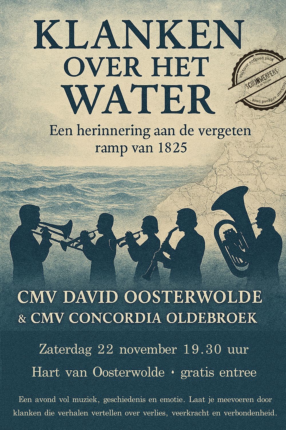 CMV David Oosterwolde en CMV Concordia Oldebroek presenteren het concert: Klanken over het water In een concert waar muziek en geschiedenis van de vergeten ramp van 1825 samenkomen tot een mooi geheel.